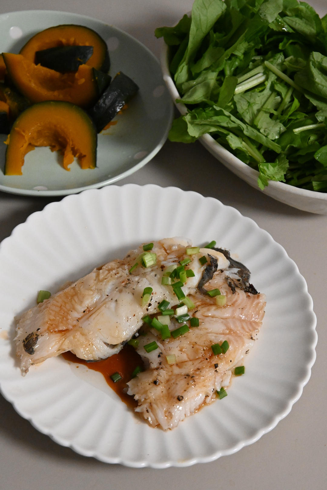 煎比目鱼+萝卜苗+蒸南瓜