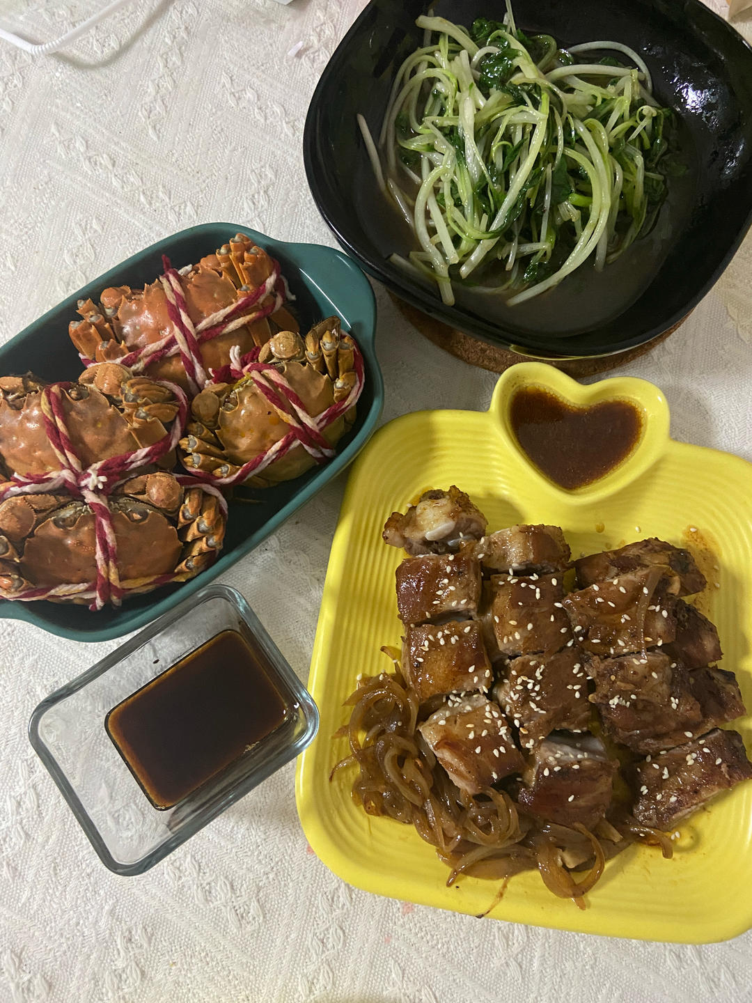 清炒白菜苗,清蒸大闸蟹,蜜汁烤排骨