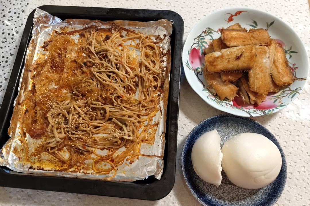 烤金针菇粉丝,香煎带鱼配馒头