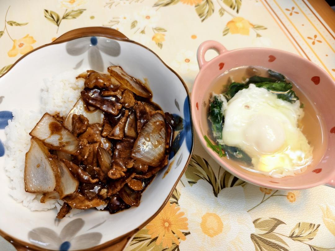 洋葱炒肉,菠菜荷包蛋汤