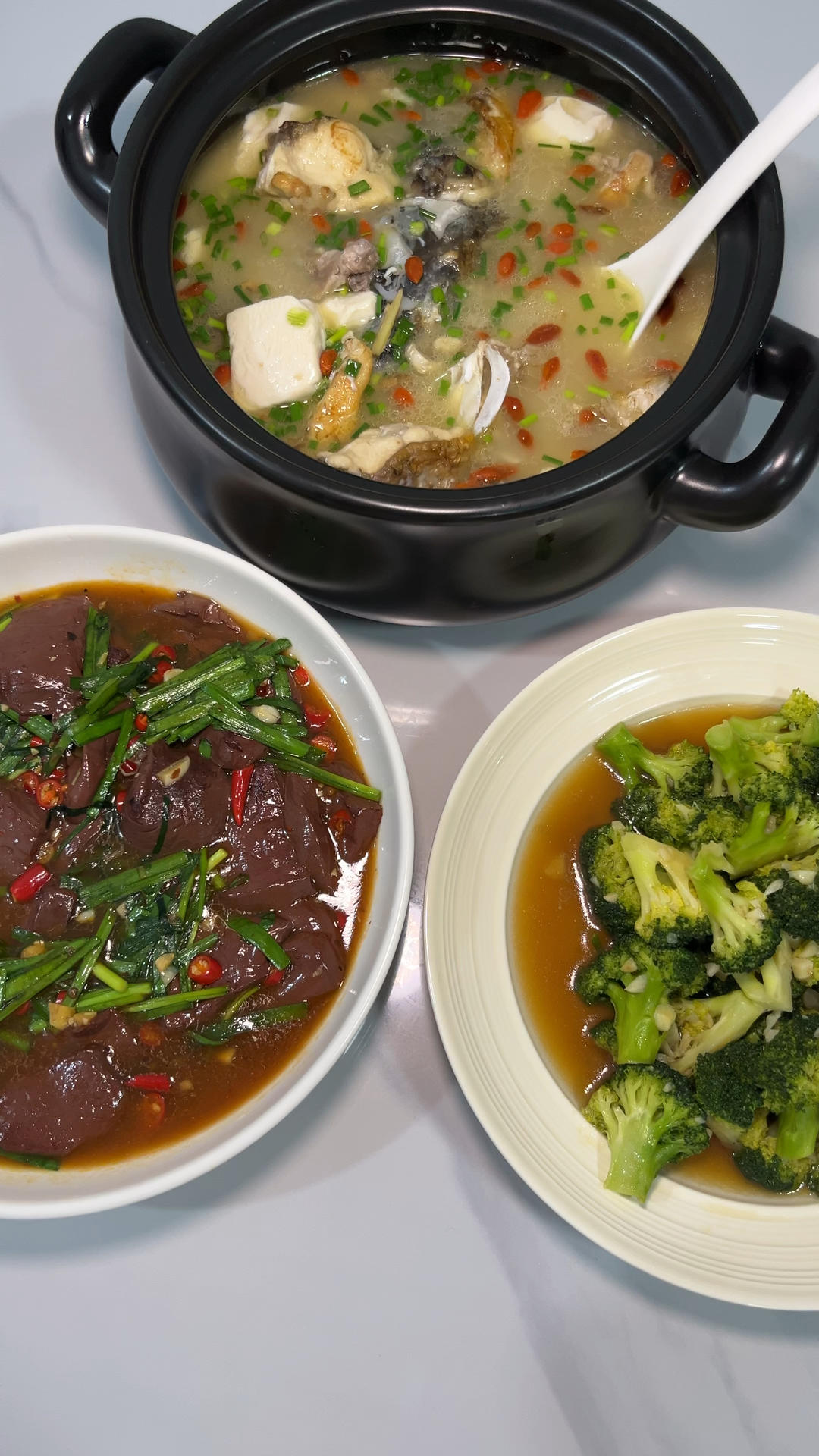 军鱼豆腐汤,韭菜鸭血,蒜蓉西兰花