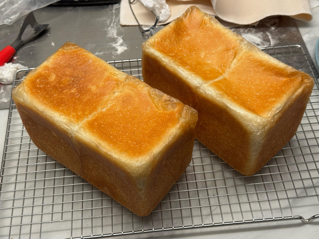 e9 170/265度,450g吐司盒,第一个22分钟,中心温度有98,第二个24分钟,第一个皮更薄软,回缩更多一些。第二个烘烤时间长一些,回缩略轻。