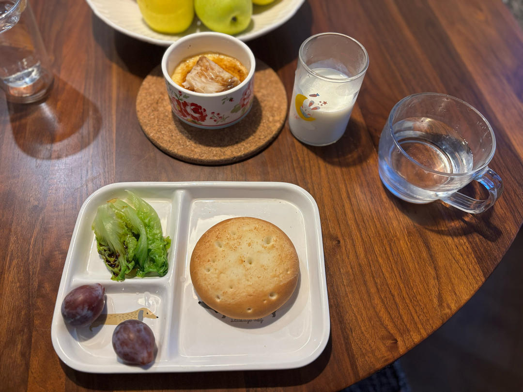 奶酪饼+鳕鱼蒸蛋+白灼时蔬&西梅+牛奶