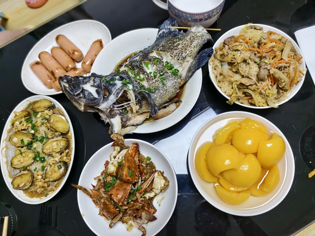 炒米粉,清蒸鱼,黄桃罐头,炒梭子蟹,鲍鱼蒸粉丝,烤肠