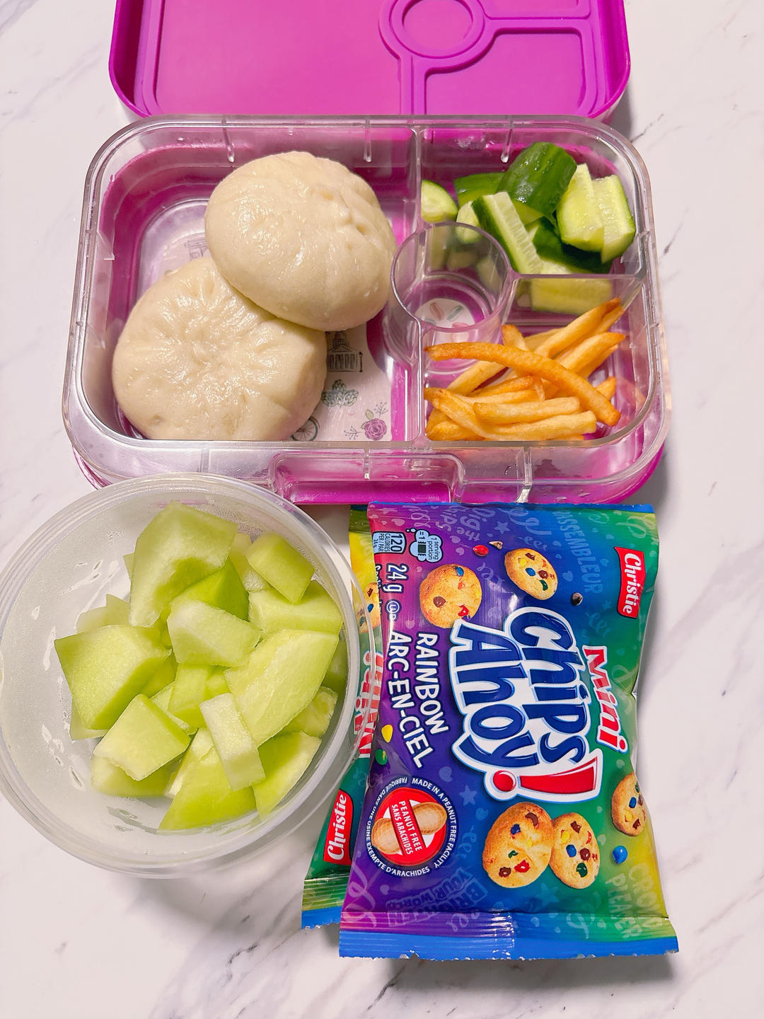 今天吃啥米 做过 mommy's cook #mommy's cook#Day35 homemade char siu bao+cucumber+fries & honey dew+chips ahoy #Nana's lunch box# 4天前