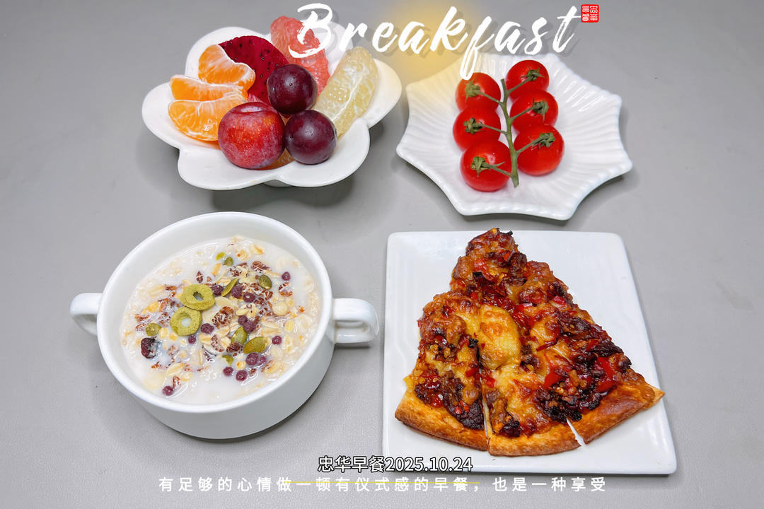 森_f3py 做过 早餐•2025年10月24日 #早餐•2025年10月24日# 🍓 花瓣盘里盛满缤纷水果:橘子、柚子、李子、火龙果、葡萄🍅 ⭐️星形小碟托起串收番茄,像红宝石般跃动;🥣 暖呼呼的牛奶燕麦粥,裹着坚果与果干的香脆;🍕 方形盘里躺着黄澄澄的迷你披萨 3天前