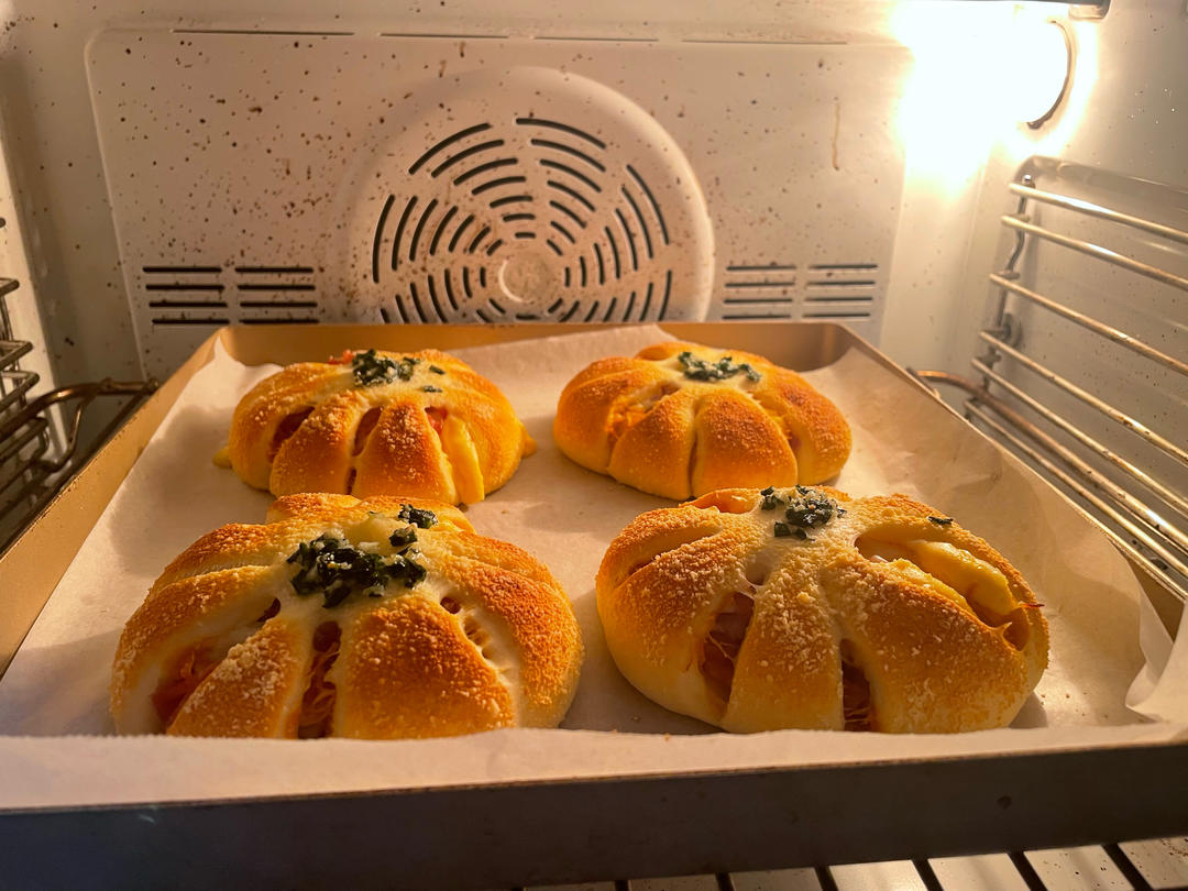 馅料是:中间挤了一点沙拉酱,放了点肉松,培根和芝士片,喜欢咸口面包的室友一口气吃了3个