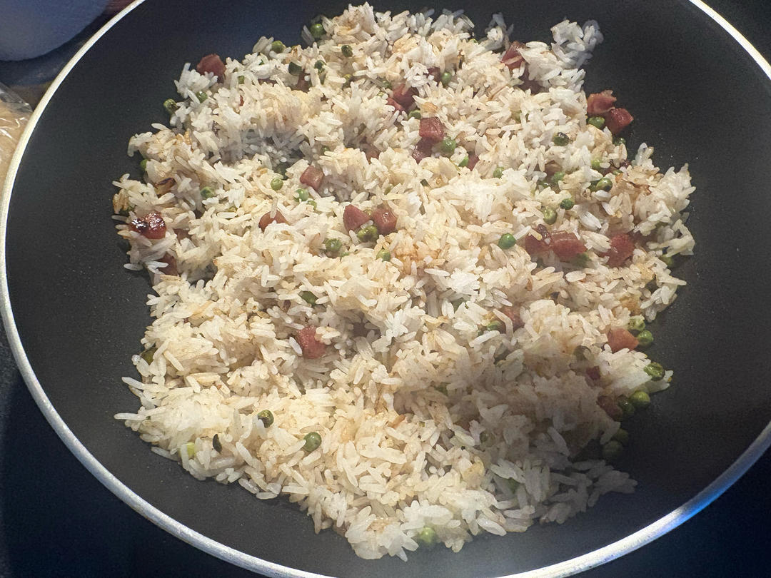 只有冷冻豌豆凑合一下,还不错啦,竟然都不额外放油,好清淡的焖饭👍