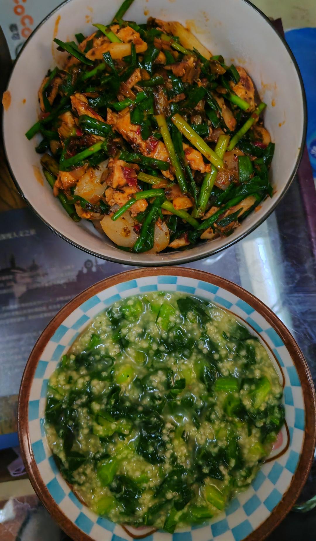 小米配菜心,真好。鸡胸炒年糕搭配,鲜花点缀,太阳公公也给力,圆满了