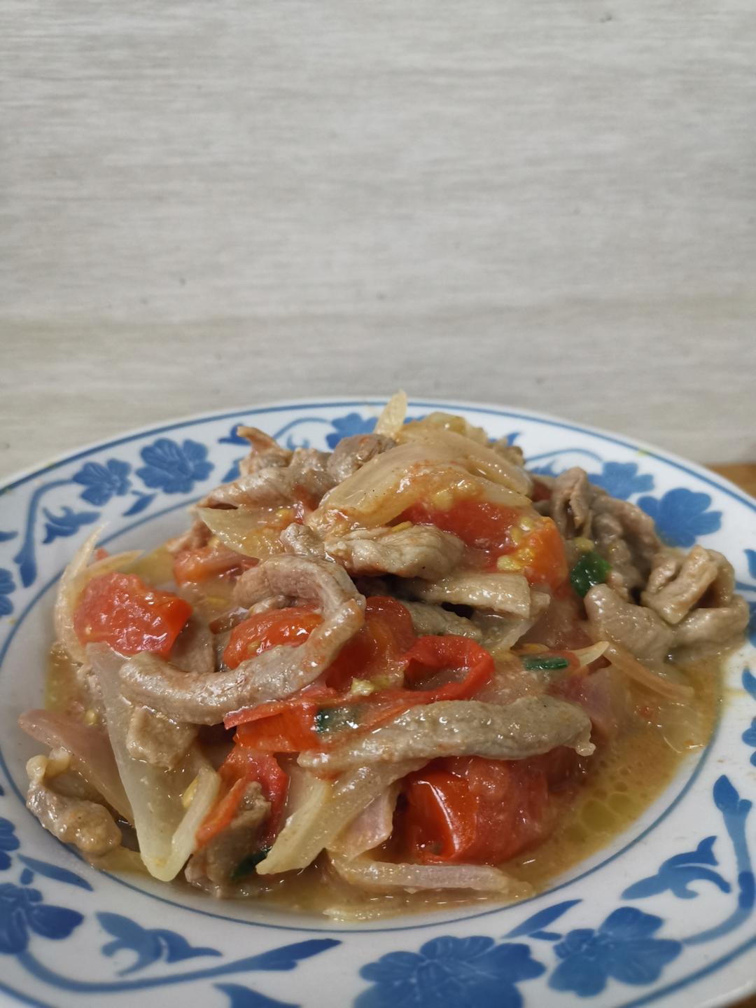 咣珰一吃 做过 晚餐•2025年10月27日 洋葱番茄炒肉片肉片酱油白胡椒粉盐少量糖豆粉料酒腌好烧热油,下肉片,翻炒到7成熟捞出下洋葱炒透明,放番茄炒软出水,撒盐和糖调味,倒进肉片翻炒一分钟,撒葱花出锅。有人不吃葱姜蒜,只能这样了👀今天最后一顿要吃好,加油#晚餐•2025年10月27日# 3天前