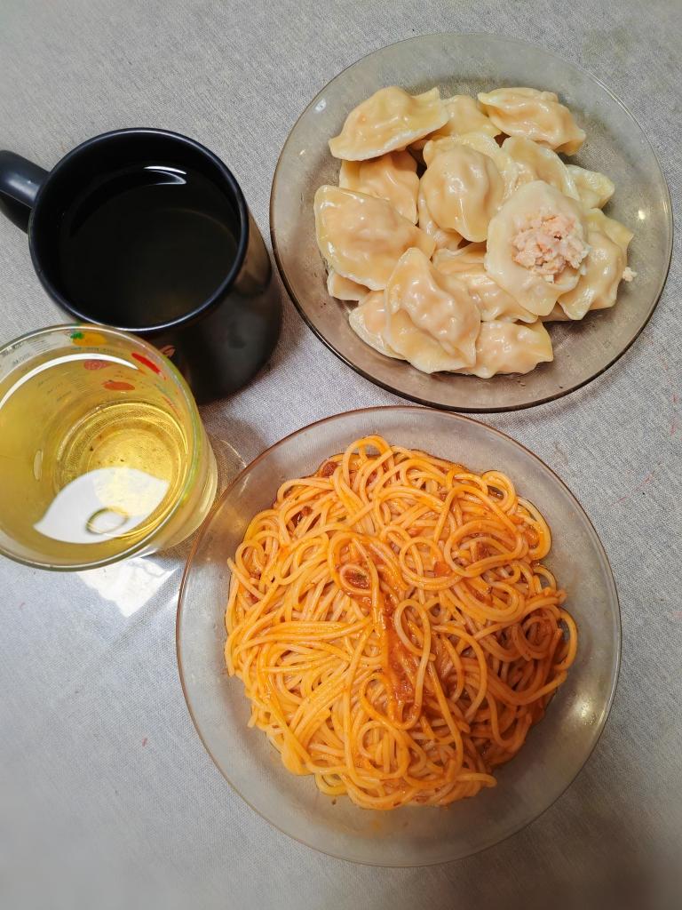 鲜虾菜肉蒸饺、低糖金银花露、番茄肉酱意面