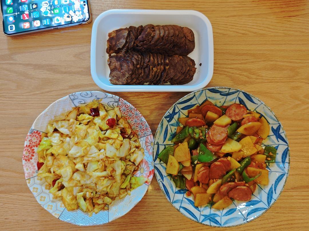酱牛肉 手撕包菜 红肠炒青椒土豆片