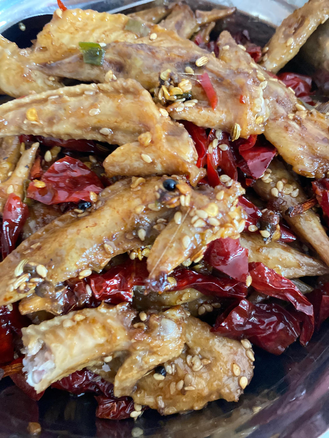挺好吃。菜籽油温降了一些后,把鸡翅里面的香料(葱姜蒜花椒)捞出来炸香,再放鸡翅收水分,再辣椒+八角炒香,然后加生抽、老抽,炒干,最后加芝麻。