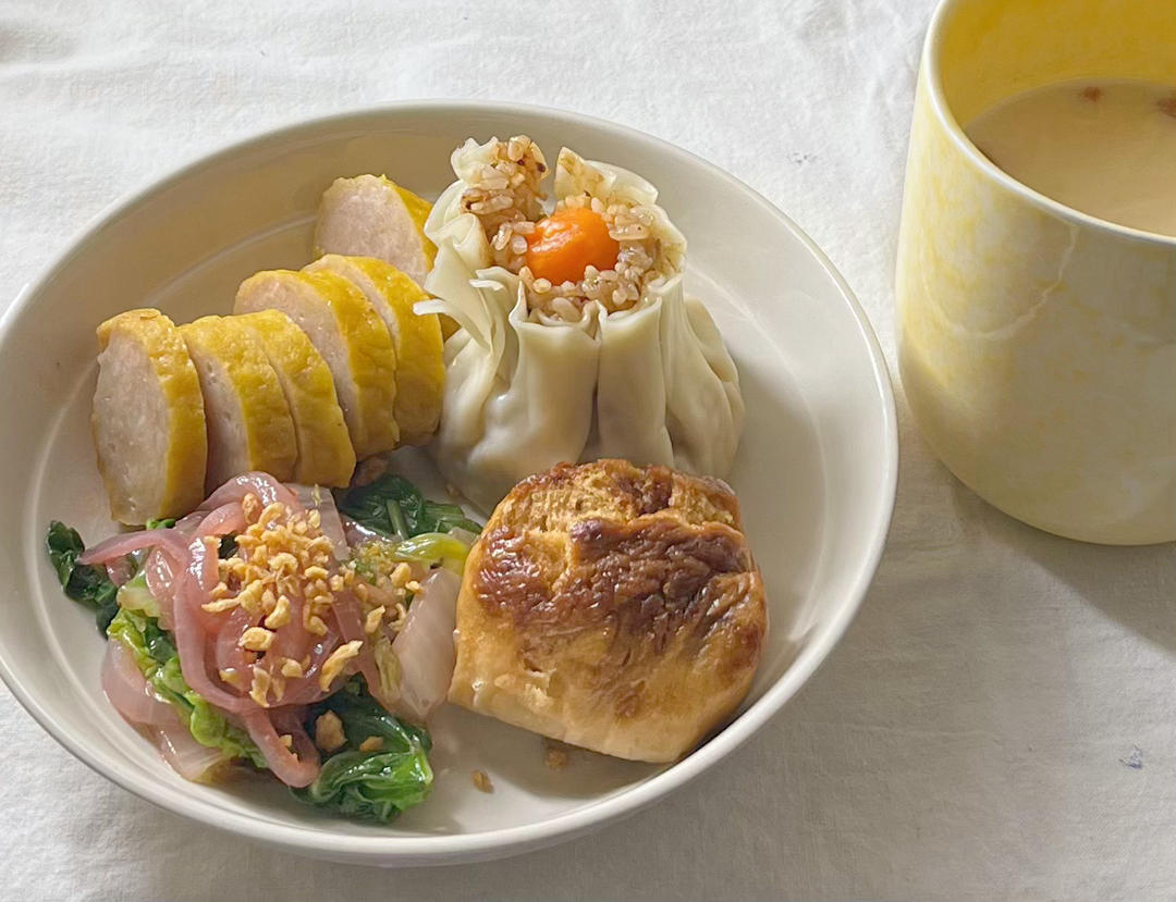 烧麦和红糖馒头+猪肉班章和清炒蔬菜+银耳椰奶,共吃了6种食物。