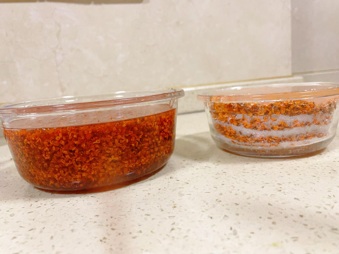 我感觉这个桂花配比太多了,全是桂花、糖浆似乎少了些,不知道是不是我糖熬太久了的关系