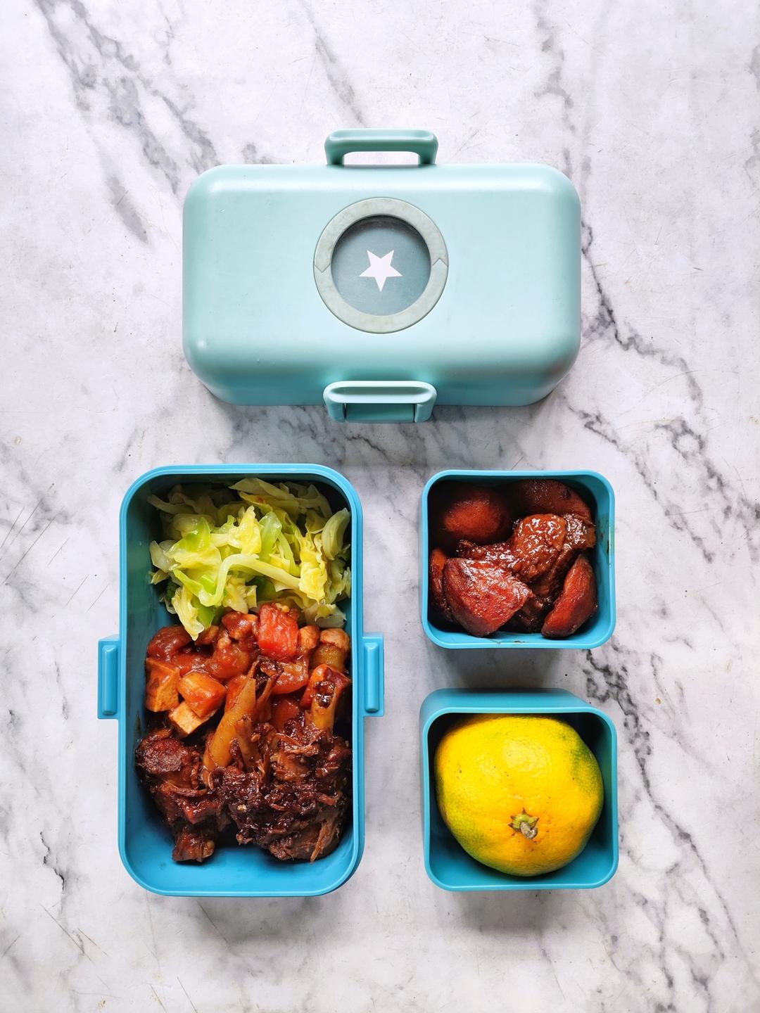 今日便当:清炒卷心菜+炒辣酱+红烧鹅+茨菇+橘子~~
