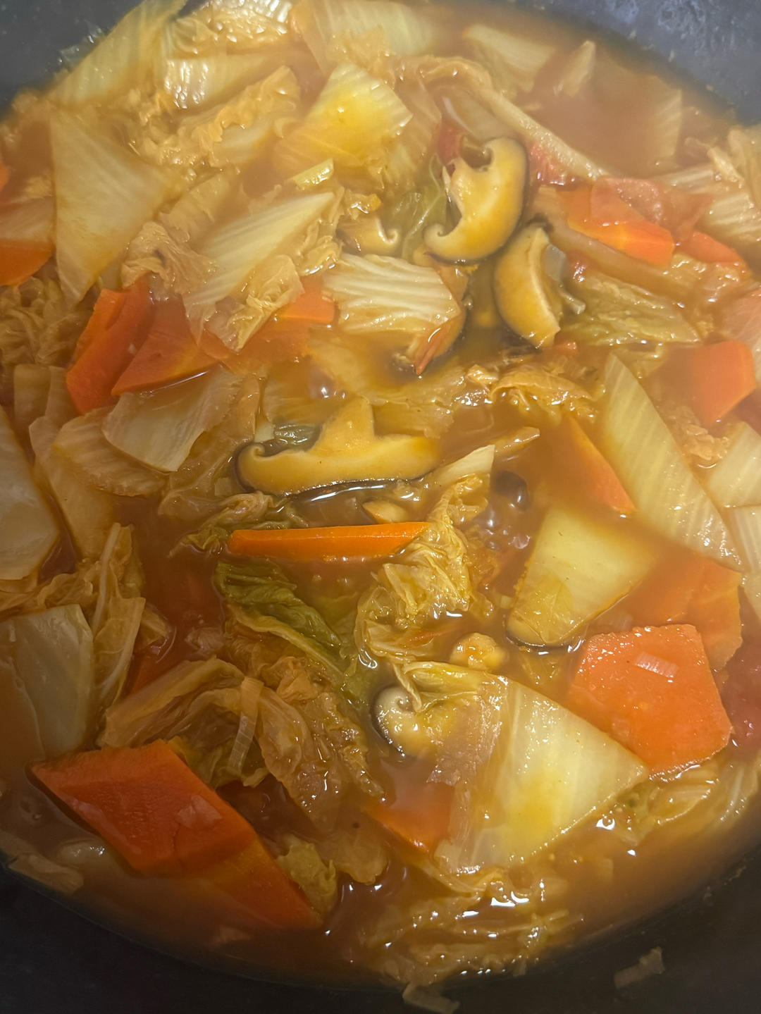 黑暗料大师 做过 大白菜炖番茄 喷香的,大白菜炖番茄,我和作者做的不太一样,我口味重,我放了欧芹盐,松茸鲜,生抽,蚝油,番茄酱🥹多加了胡萝卜片,汤特别浓郁🥹而且我并未重新起锅,直接放里炖炒的,因为我懒🤣味道老毕了😘 2025-11-11