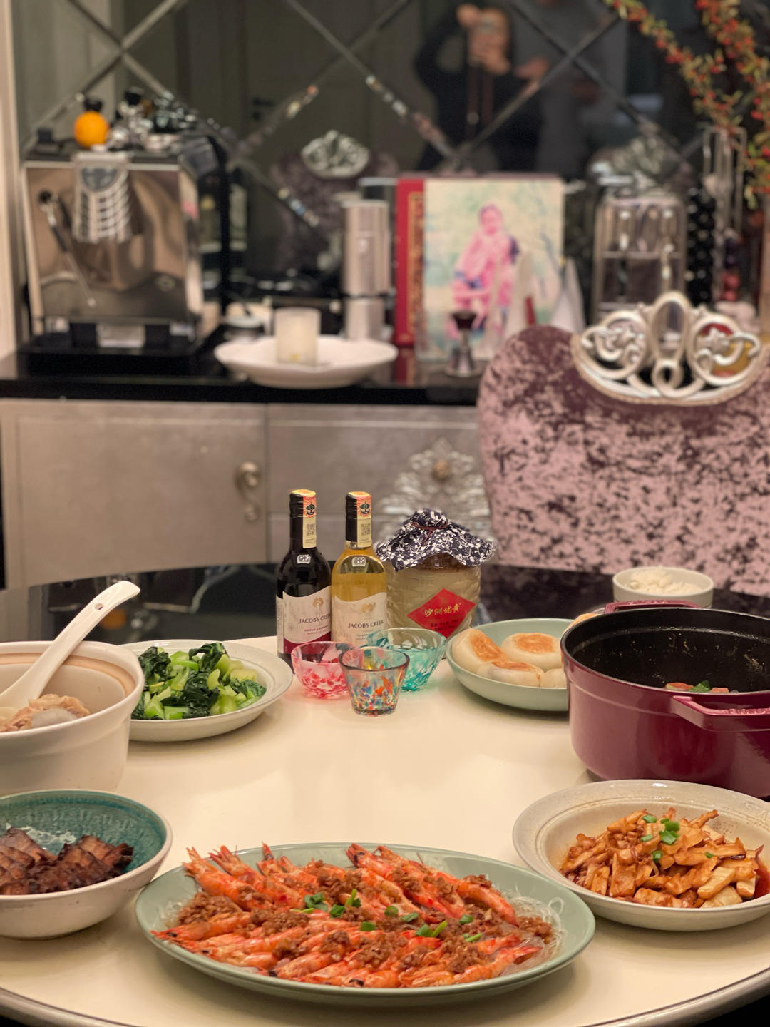 今天冬至,炖羊肉胡萝卜、老妈酱肉、油焖笋、蒜蓉粉丝开边虾、青菜、骨头汤