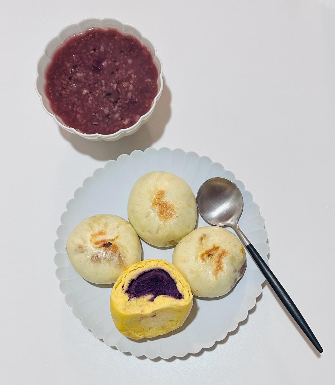 八宝粥,紫薯馒头,肉包子
