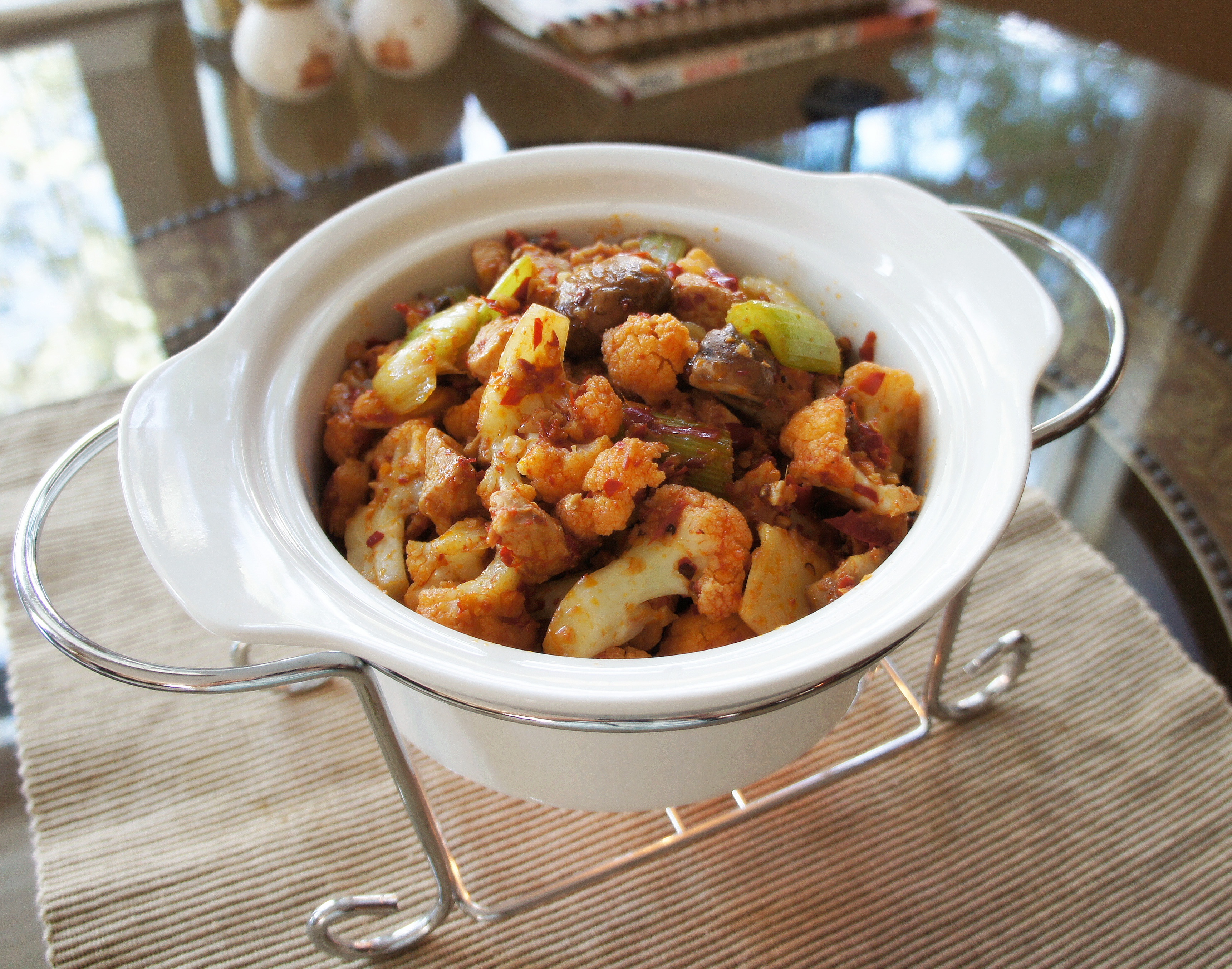 剩下的辣子鸡,加上了菜花、蘑菇、芹菜,又加了少许花椒,变成了麻辣干锅