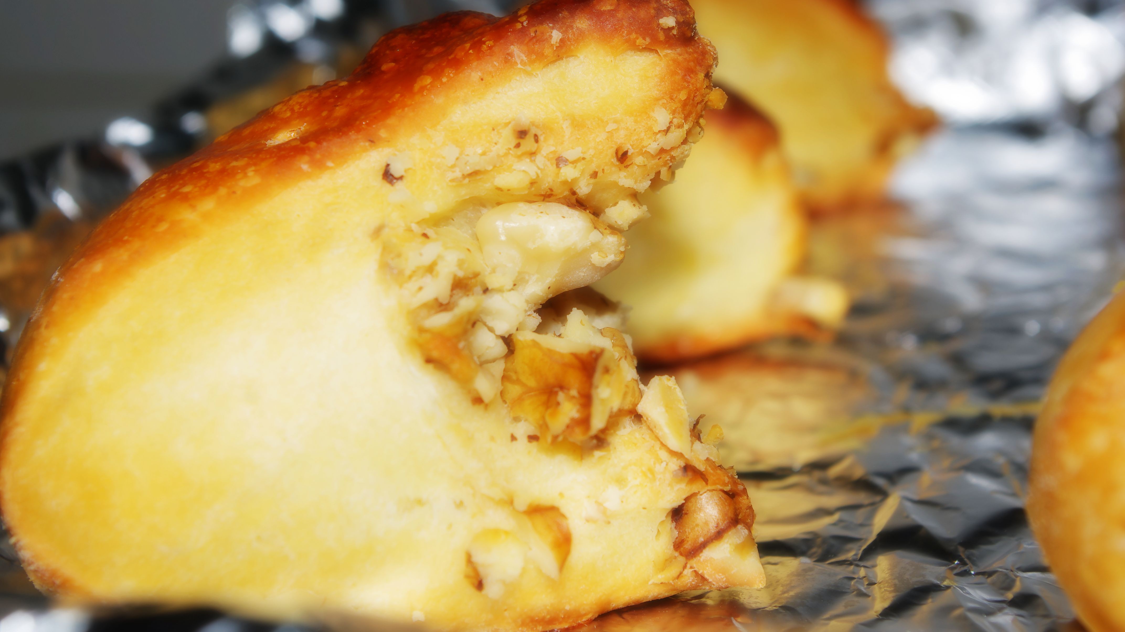这次放在室内发酵一个晚上,面团变得圆圆胖胖的,早上切一切丢进烤箱一烤,热乎乎的来一块,很棒啊。按照方子后面的建议这次加了核桃碎。