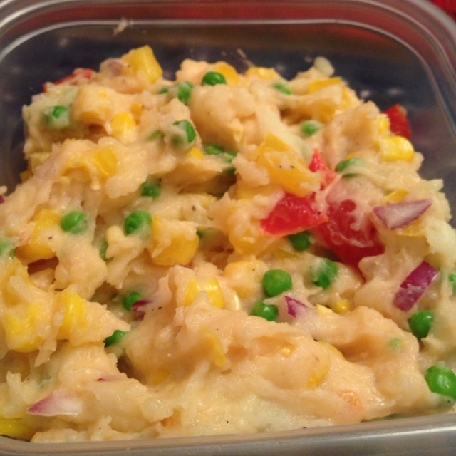 一个土豆蒸熟用牛奶拌好,速冻玉米青豆小半碗用橄榄油炒一下 迷你小洋葱一个 黄色甜椒半个 西红柿半个 盐少许 色拉酱 黑胡椒少许