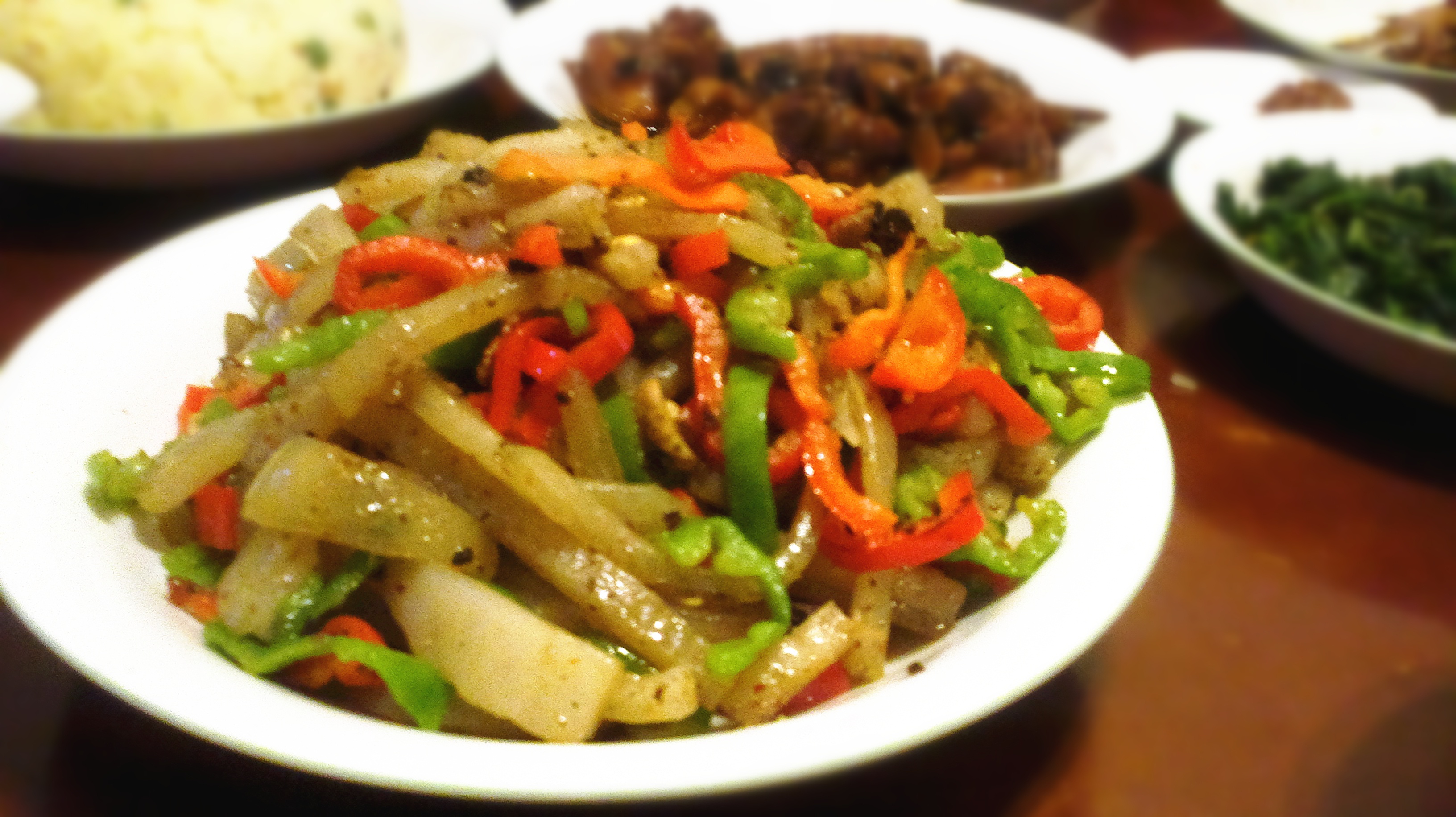此刻心满意足 做过 尖椒炒肉皮 考虑到颜色的搭配,用了两种颜色的椒。由于在麦德龙买的大袋猪皮,没有注意很多猪皮上面盖了彩色的章,所以扔掉了很多……这是一道很香的菜,只是父母担心胆固醇高,所以吃得相对少了一些~另外,用姜和煮一下对去腥味确实很有帮助,加点盐进去一起煮,也同时解决了猪皮不容易入味的问题。炒出来很香。 2013-04-10