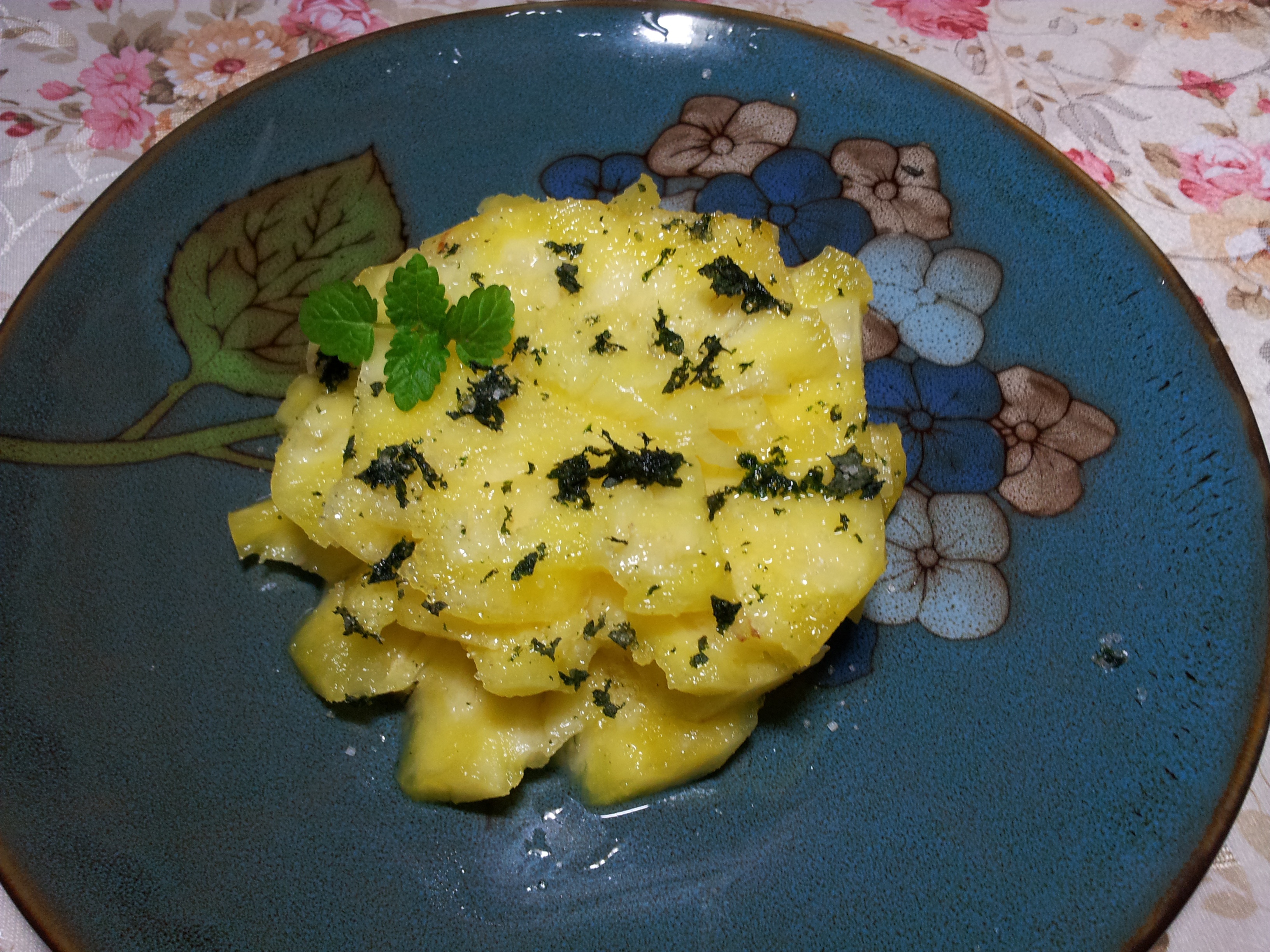经过菠萝3吃终于把一整个菠萝吃完了。我的薄荷叶洗完自然风干后居然变黑惹。但是我想说,这个口感太奇特惹!我喜欢!