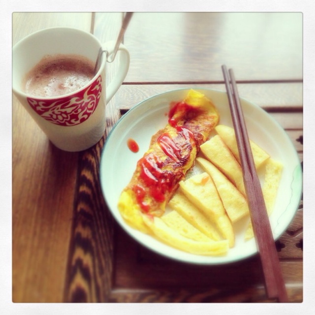家里剩的材料不多 干脆做的蛋包火腿肠 酱汁用的甜辣酱和番茄酱〜