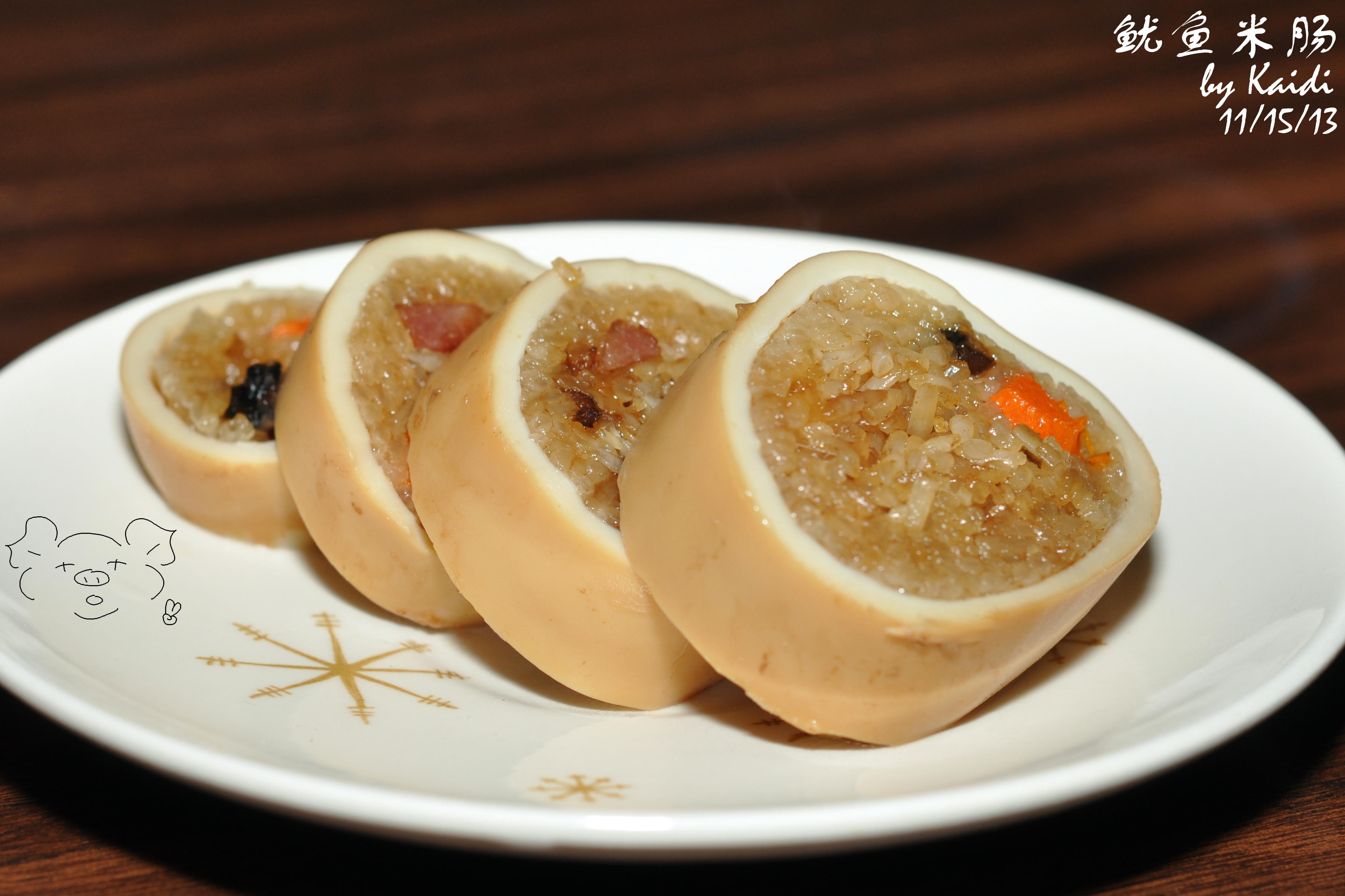 终于拔草啦!糯米里放了腊肉,香菇和胡萝卜,往鱿鱼里塞的时候一定不能塞太满,因为鱿鱼煮过之后还会缩小。
