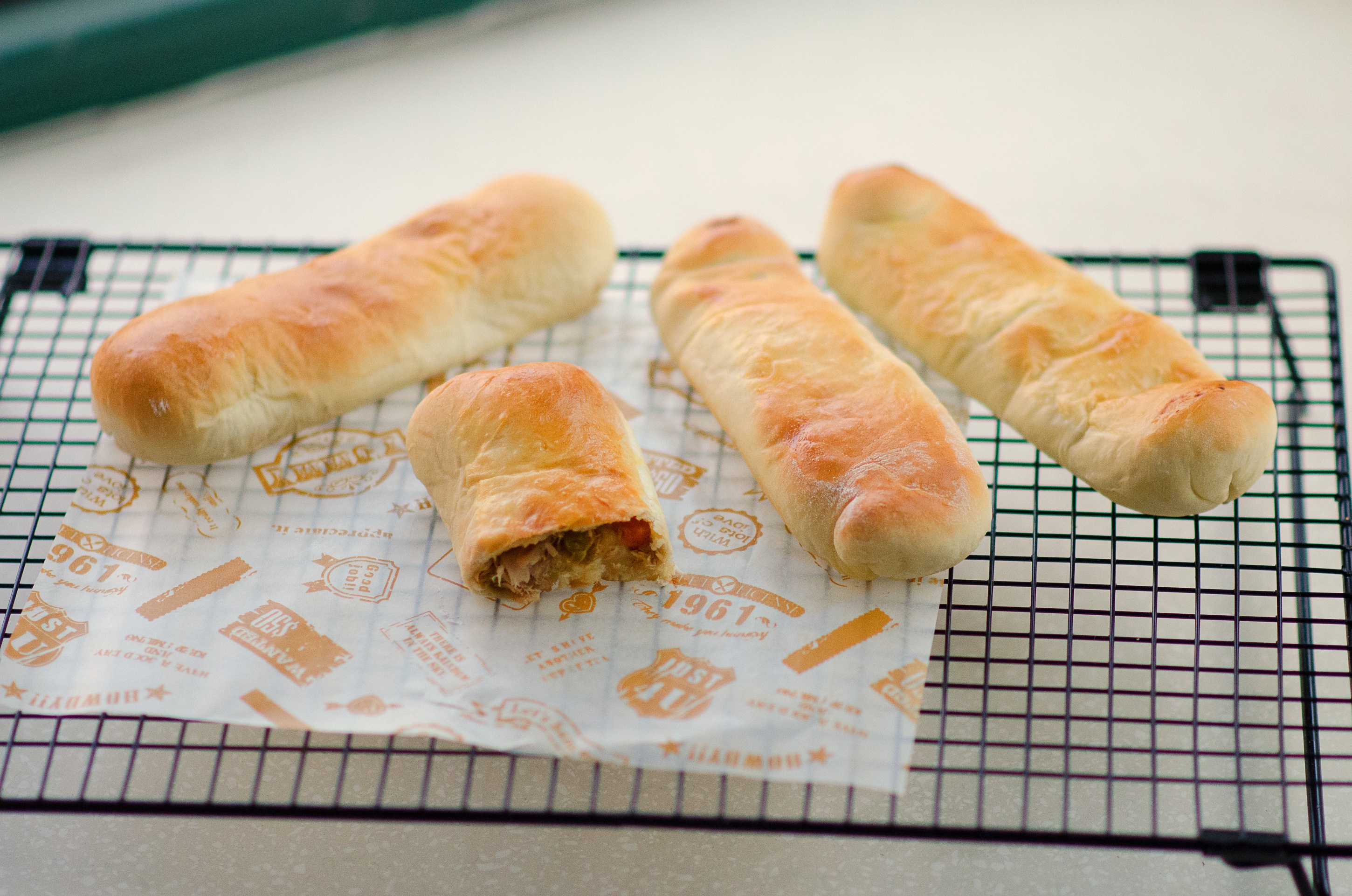 今天下午又做了一遍,这次是面包机揉了7分钟才投奶油奶酪,并且用烤箱做的第三次发酵,烤出来终于真正像面包了Q...