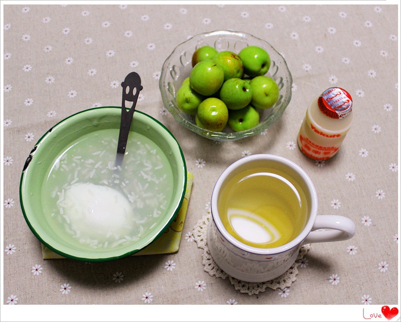 早餐,醪糟荷包蛋,冬枣,养乐多和柠檬茶。