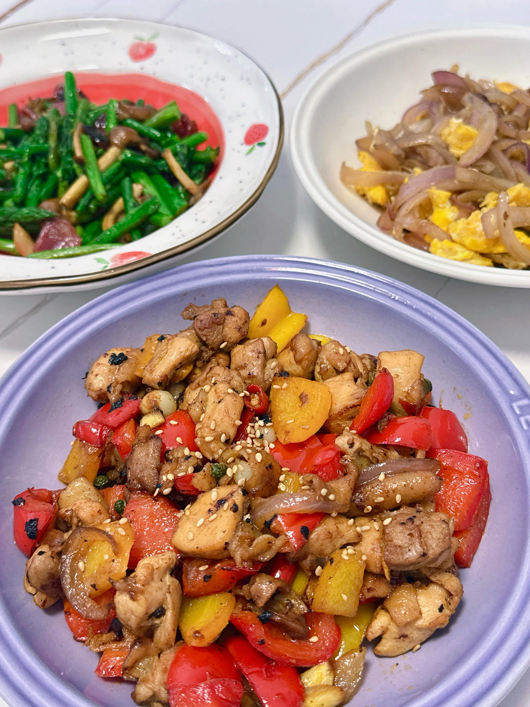 彩椒炒鸡腿肉,芦笋炒腊肠,洋葱炒蛋