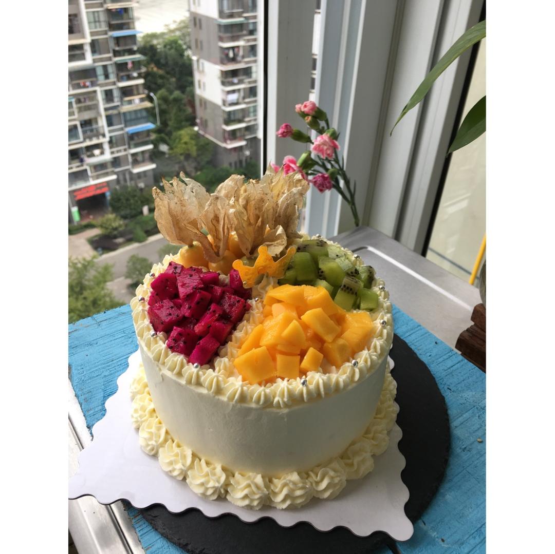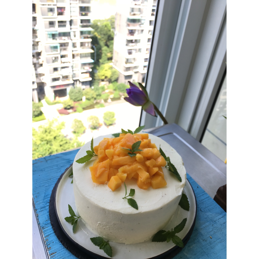 八寸戚风,夹心芒果慕斯!蓝风车抹面!还是用花装饰简单...
