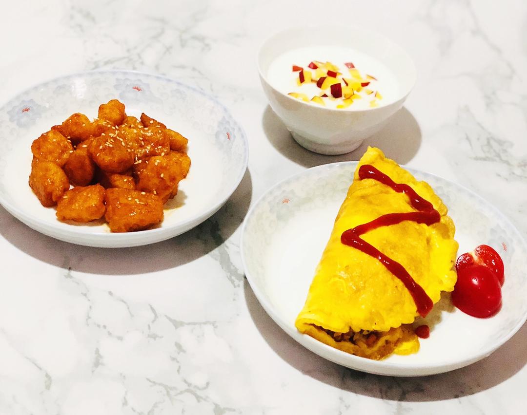 蛋包饭+糖醋龙利鱼+水果酸奶