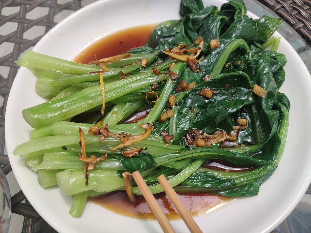 蒜爆香到有点焦,洒上蒸鱼豉油,很省事,味道好极了!吃了一半才想起来拍照📷