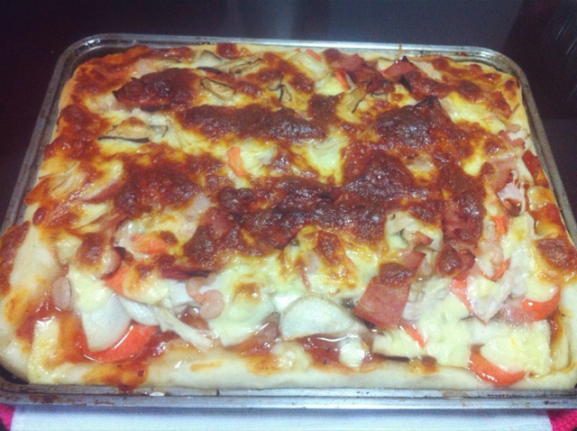 用料超足的菌菇鸡肉培根大披萨〜