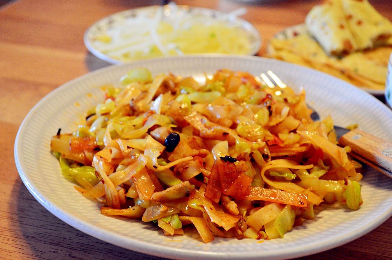乱入炒饼(我吃的)(^∇^)+凉拌土豆丝+杂粮粥+葱花蛋饼(嘿嘿~不是我吃的)♪(´ε`...