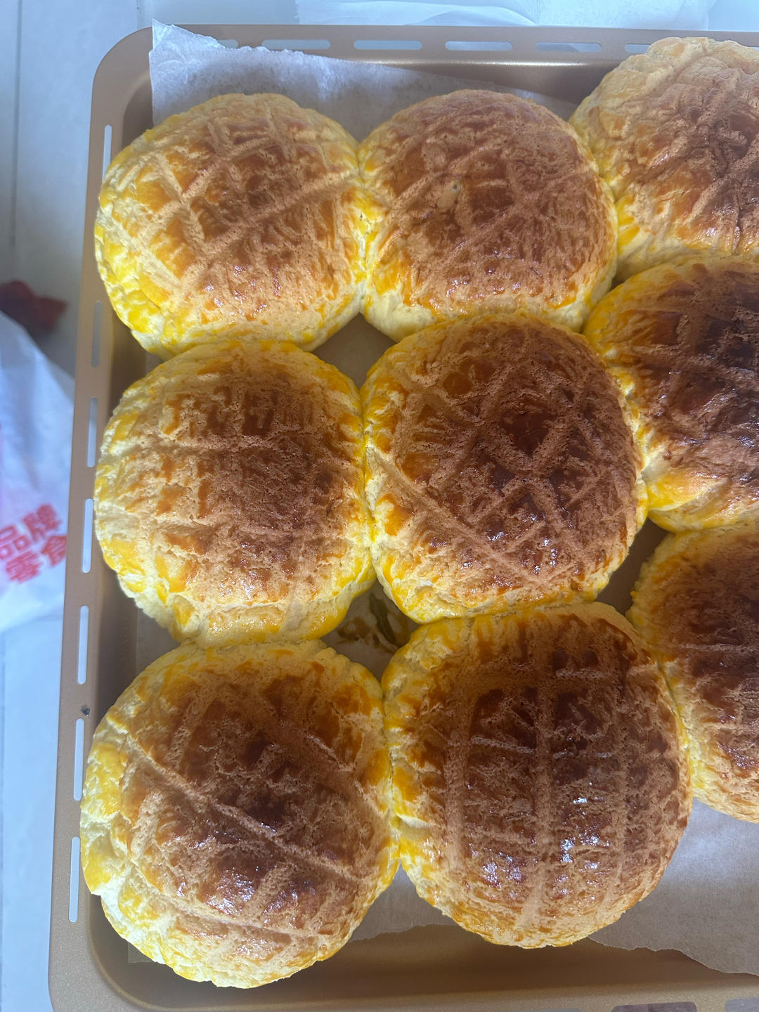 37℃高温,第一次做菠萝包,整整两盘,③小时出成品。