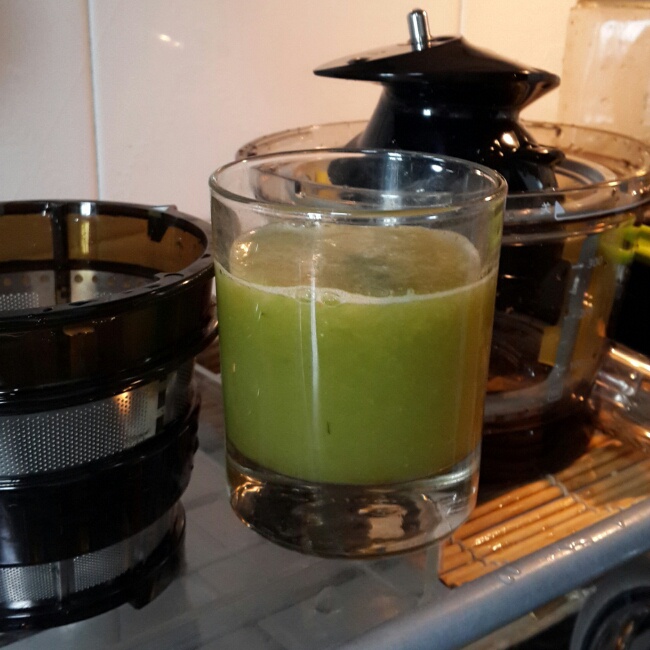 午后的一杯果汁。黄瓜,胡萝卜,苹果,橙子,香蕉,柠檬各一个。颜色不好看,味道酸甜。