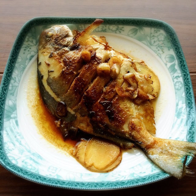 红烧鲳鱼。老酒酱油和白糖酱汁还不错哟。