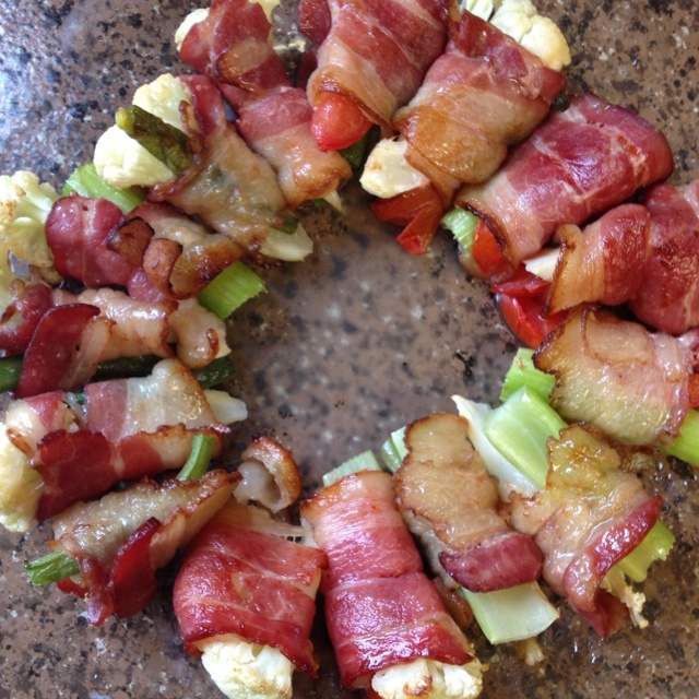 里面加的西红柿,西芹,花菜,味道不错,不过老实说培根的油真的好多,烤了一盘子的油。。。