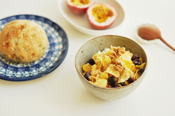 酸奶+脆脆的谷物片什么的,再把百香果拌进去 很喜欢的吃法!那个不起眼的面包是西兰花面包♪
