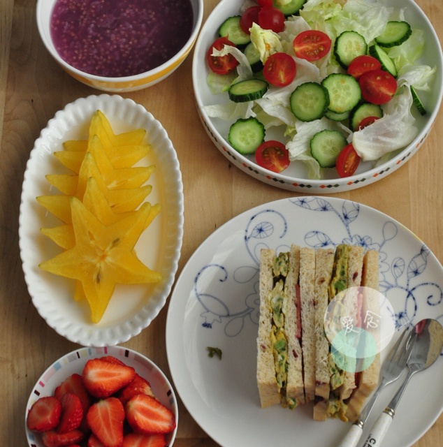 周三早餐:香椿煎蛋培根三明治,紫薯粥,蔬菜沙拉,杨桃&草莓。杨桃闻起来很香甜,吃着...