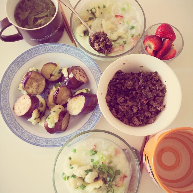 蔬菜粥 茄子鱼饼 芽菜肉末。