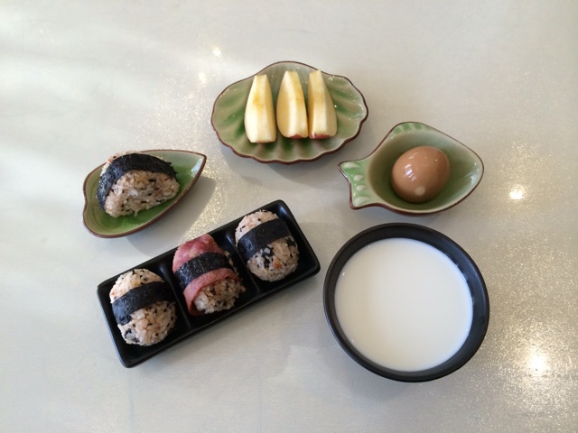我的营养早餐【海苔培根饭团】【海苔肉松饭团】【茶叶蛋】【鲜牛奶】【苹果】