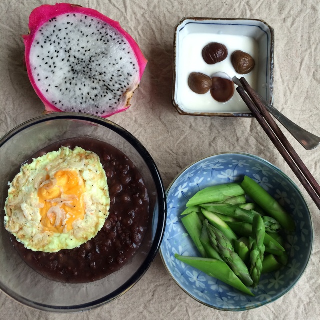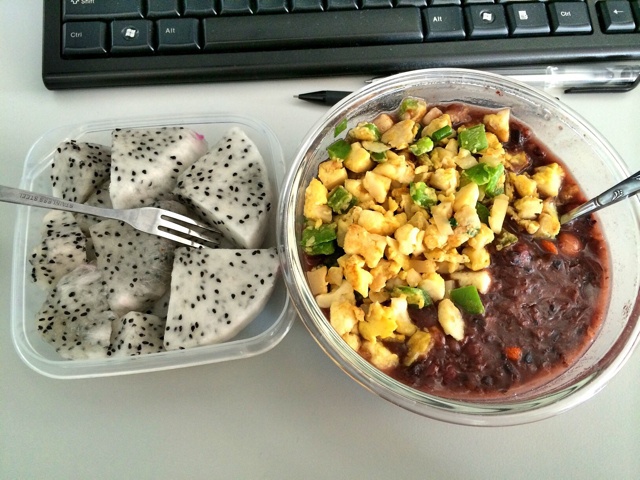 杂粮粥,花菜青椒虾米炒鸡蛋,火龙果半个~