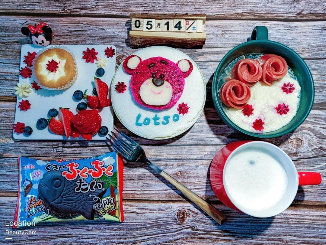 😍草莓熊酸奶蛋糕,绽放鸡蛋糕,水果拼小蛋糕,热牛奶,鲷...