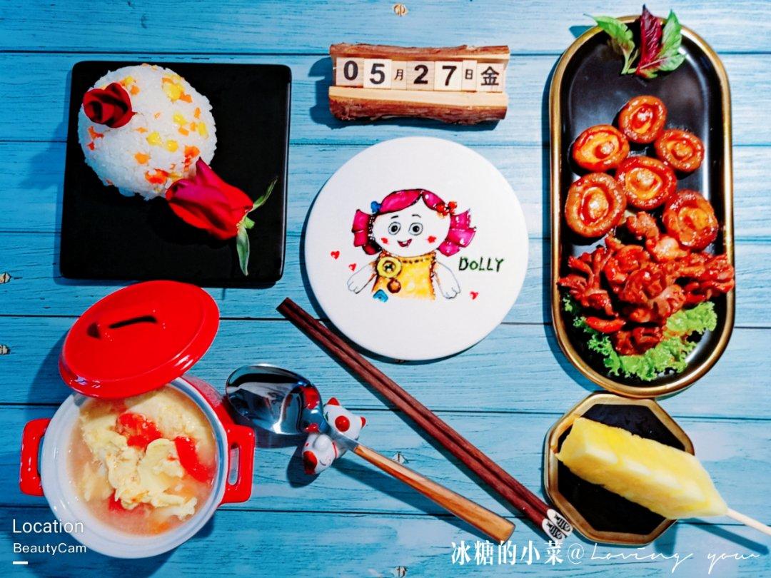 😘丑娃娃画盘,胡萝卜玉米炒饭,香菇配鸡胗,西红柿鸡蛋汤,都...