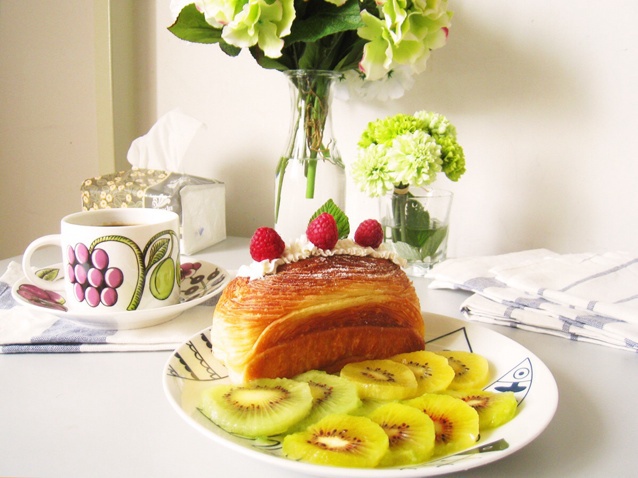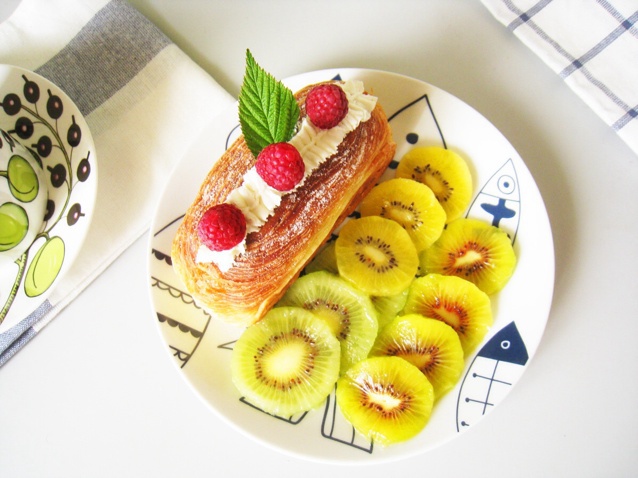忍不住再传一张。。凹造型,用裱花嘴往可颂头上挤了一丢丢希腊酸奶。顺便集齐三色猕猴桃召唤神龙!PS:那只本该绿色的你为什么...